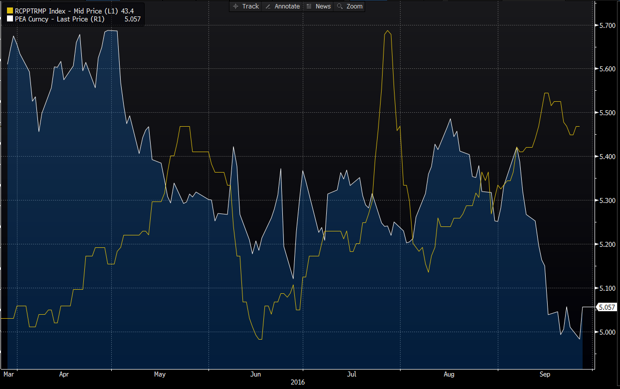 Yep, and of course, the peso and Mr. Trump’s odds tend to correlate quite negatively.
