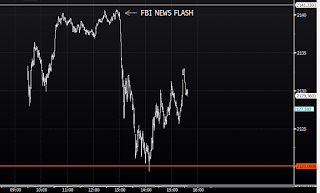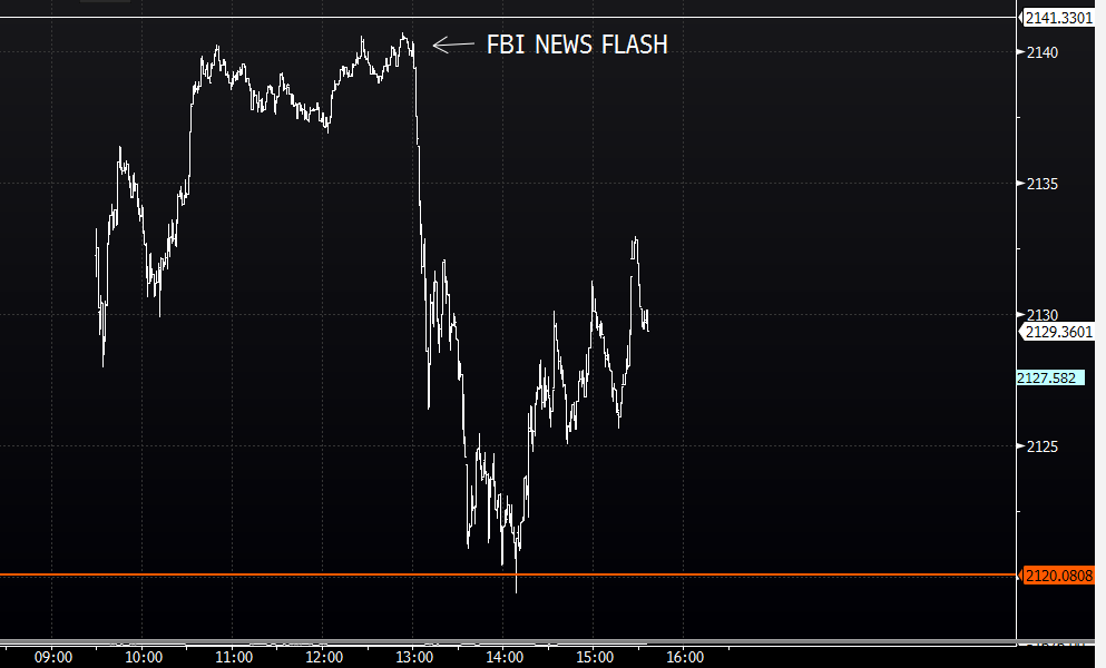 Well, I was in my car this morning when I heard the news regarding the FBI and one presidential candidate’s email activities. Based on how the trading’s been relative to election probabilities, it wasn’t hard to predict that the market would not greet such news warmly. As you can see below, before the news the S&P was up quite nicely. Notice the reaction, and notice how support held at that orange line: