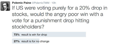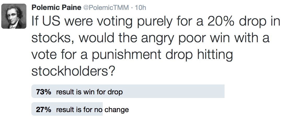 Even if economists are to be listened to, does that mean they will be followed. If we striped down the election to, say, a call on whether you want the stock market to stay the same or dump 20% the outcome is very dependent upon if you own stock or not and what your opinion is of people who do own stock. I would imagine that the non-stock owning poor may well outweigh the stock holding rich and vote for a dump just for some schadenfreude equality leveling. Twitter seems to agree