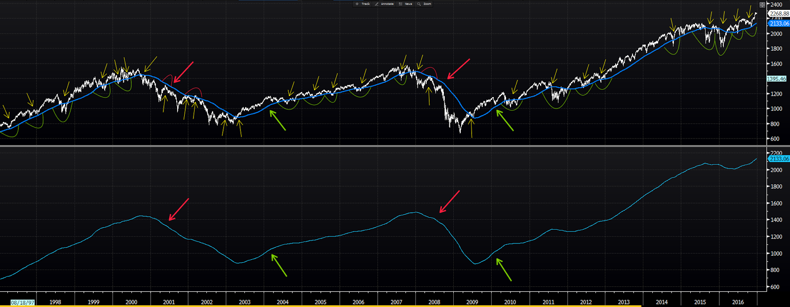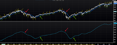 So let’s check it out. Here’s a look at the 20-year daily chart of the S&P 500 Index. The top panel includes the index value (white) and its 200-dma (blue). I also placed the 200-dma by itself in a second panel — as it’s easier to follow the shape without the price jumping around and through it. I placed yellow arrows in panel 1 at every instance where the price bumped against or dipped below the 200-dma. These would be areas of warning that the trend is at risk of reversing. The red arrows point to areas where our indicator signaled the end of an uptrend. The red curves highlight failed upside breaks that would’ve been profitable selling opportunities for the technician. The green curves highlight the failed downside breaks that turned out to be profitable areas of entry. The green arrows show a clear upward reversal in trend: click charts to enlarge…