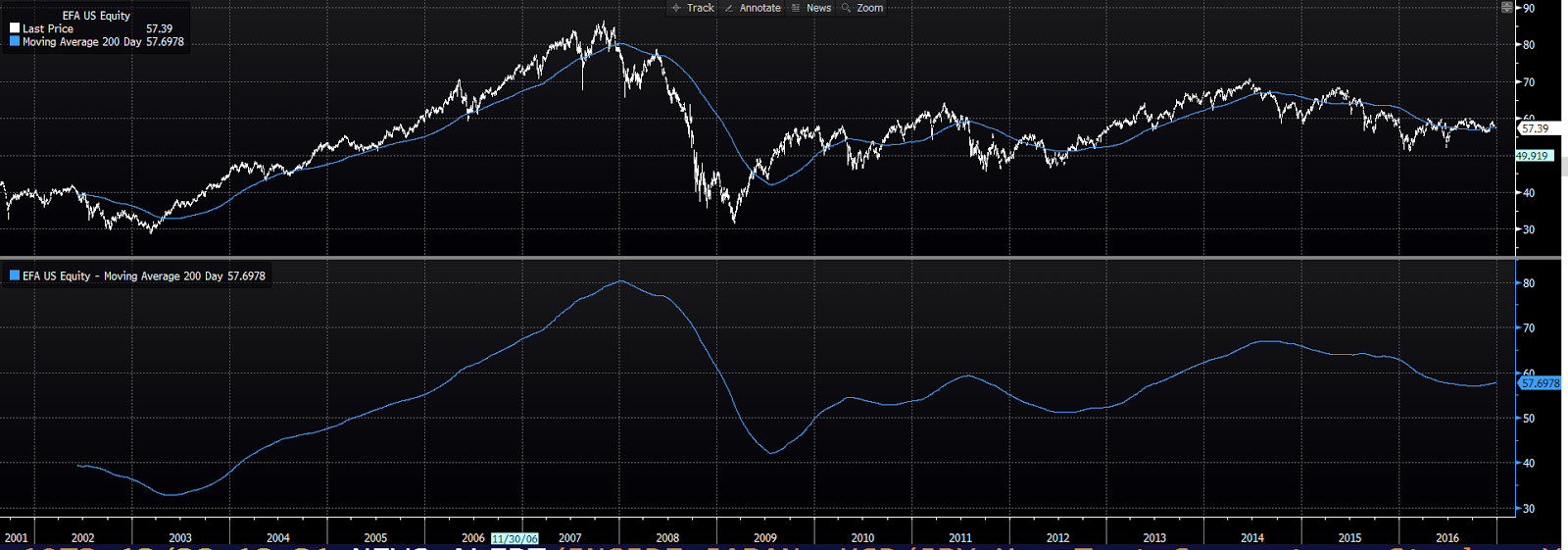 At the very top of our list is what’s called the 200 day moving average (dma). It’s a deceptively simple indicator: a security’s average closing price of the last 200 trading days. It essentially quiets the noise and illuminates the longer-term trend, or strength, of the security, commodity or index in question. I like it because, as you’ll see in the following, it lives up to its reputation as one of the best gauges of trend.