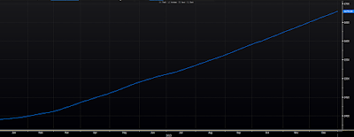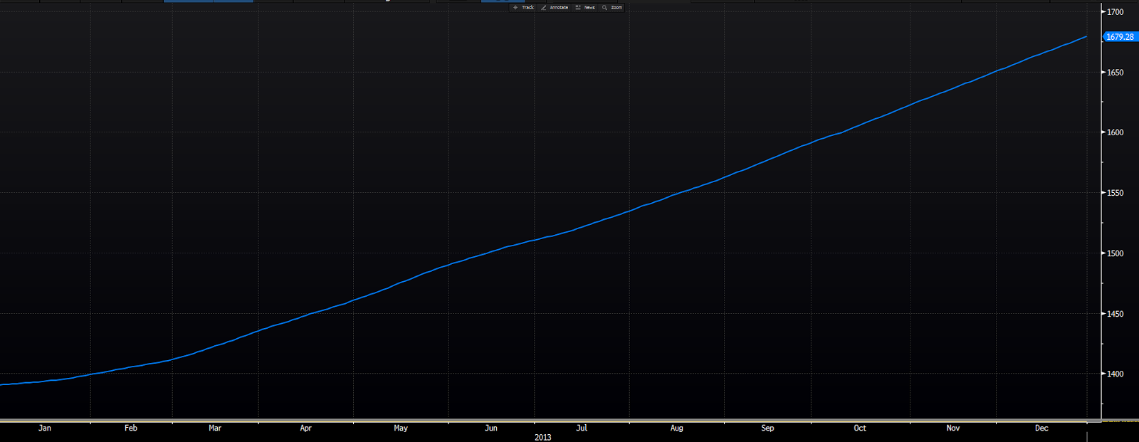 First, we isolate 2013; the last super good year we had in the equity market. Here’s the S&P 500’s 200-day moving average start to finish in 2013: