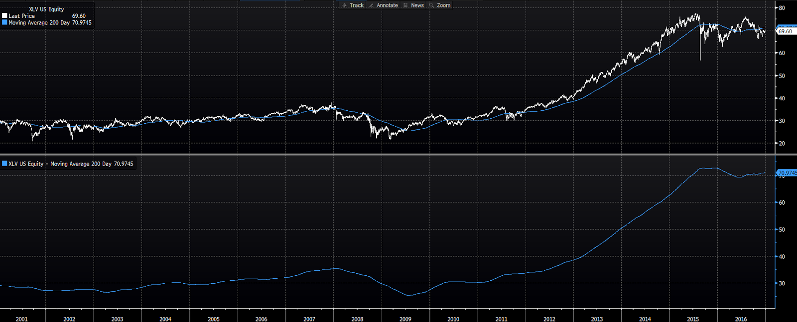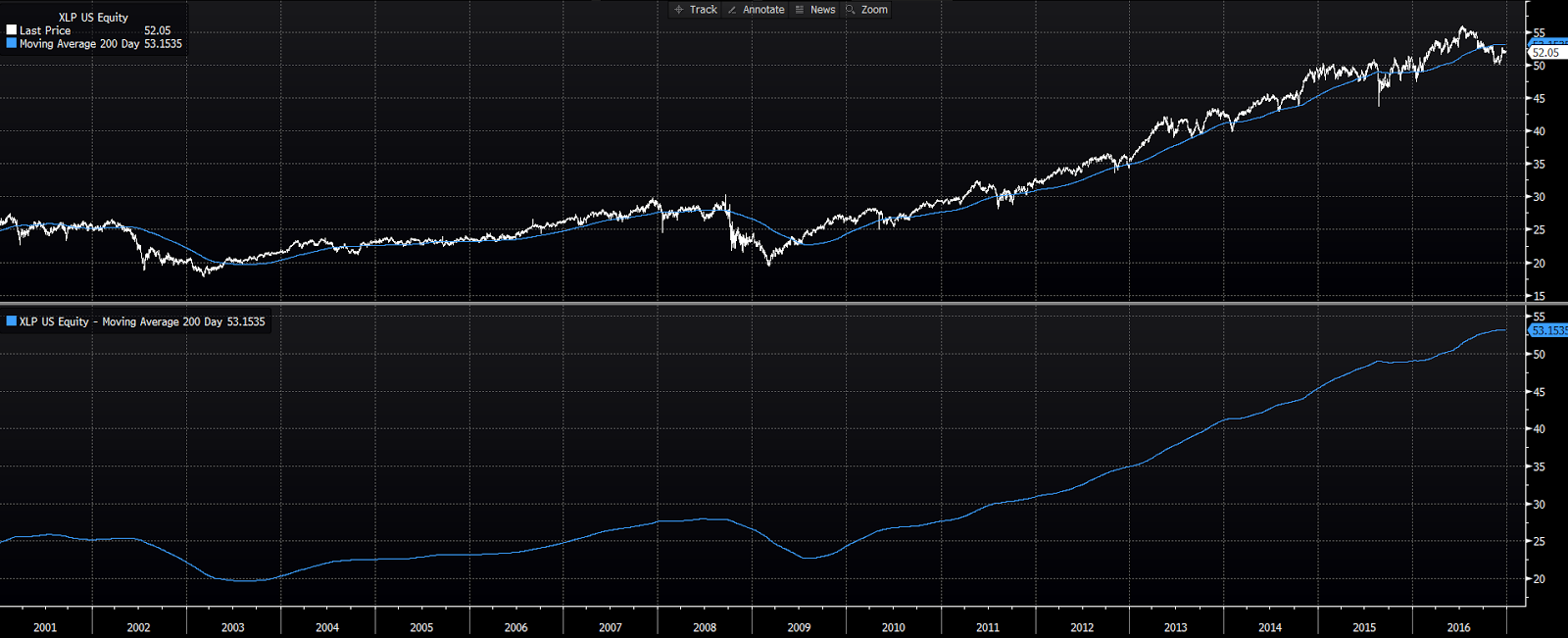 A flattening 200-dma and price trading below the line is a signal that the long upward trend in consumer staples stocks is suspect.