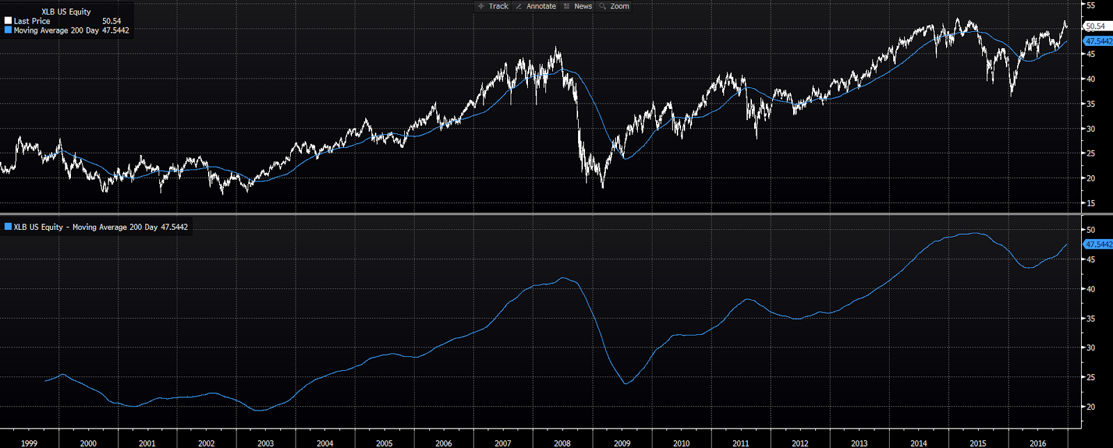 After peaking in late-summer 2014 and suffering a steep prolonged decline (with 200-dma confirmation a few months in), the energy sector bottomed in early 2016 and has staged an impressive comeback. Presently trading above its upward-sloping 200-dma.