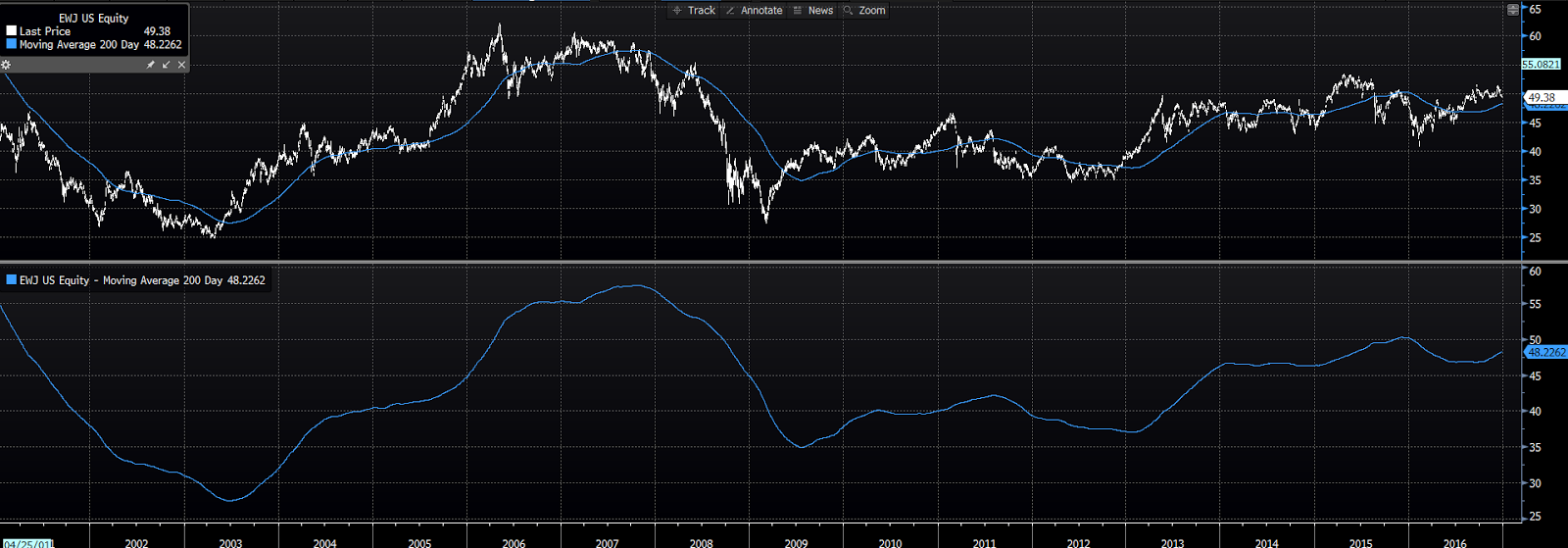 The EEM’s (tracks the MSCI Emerging Markets Index) 200-dma suggests that this year’s rally could be the beginning of a longer-term trend. However, the post-U.S. election swoon has the price currently testing the trend line. This’ll no doubt be the stuff of upcoming commentaries.
