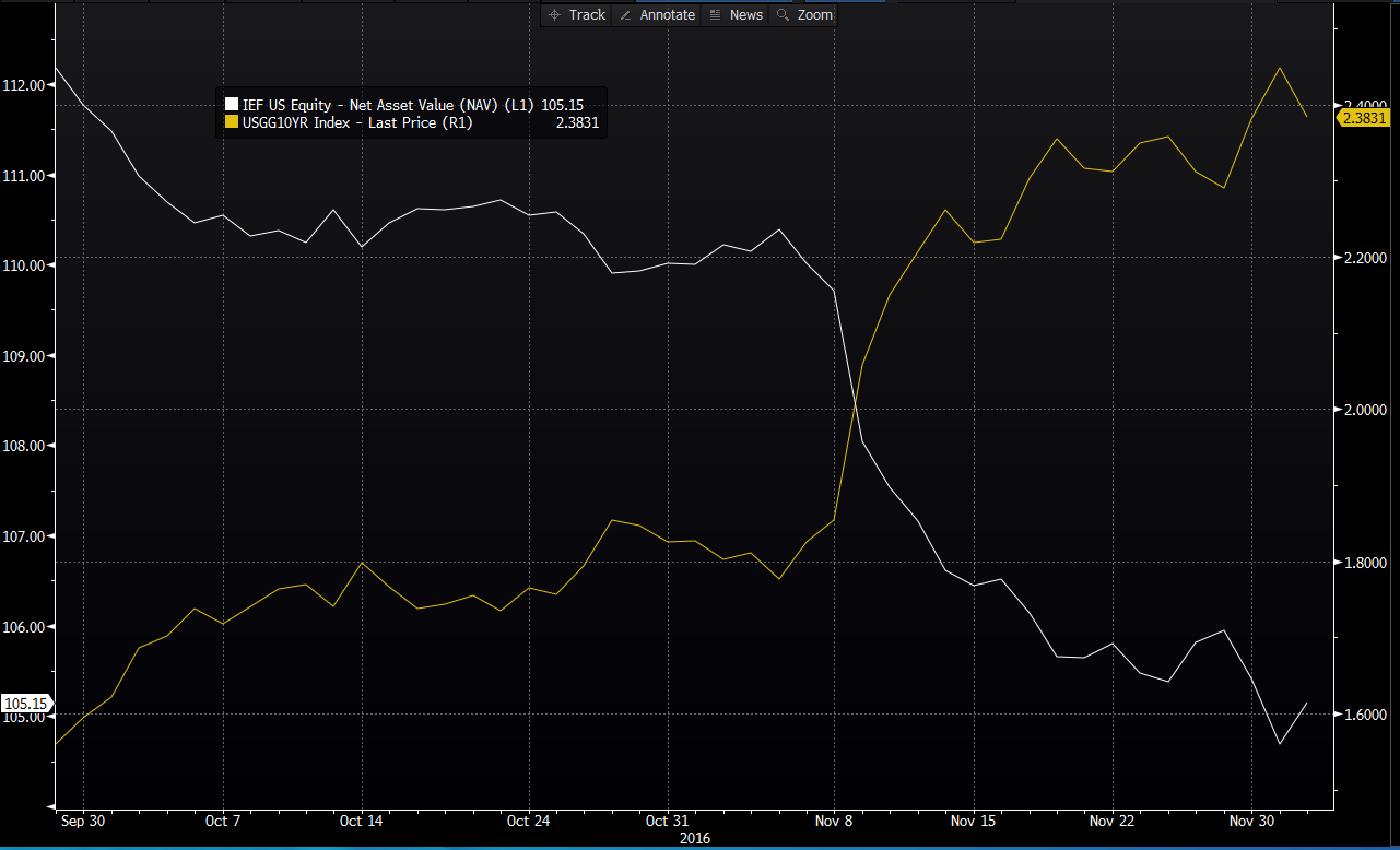 The yellow line is the yield on the 10-year treasury bond yield (interest rate), the white is the share price of IEF (an exchange traded fund that tracks a 7-10 year treasury bond index):