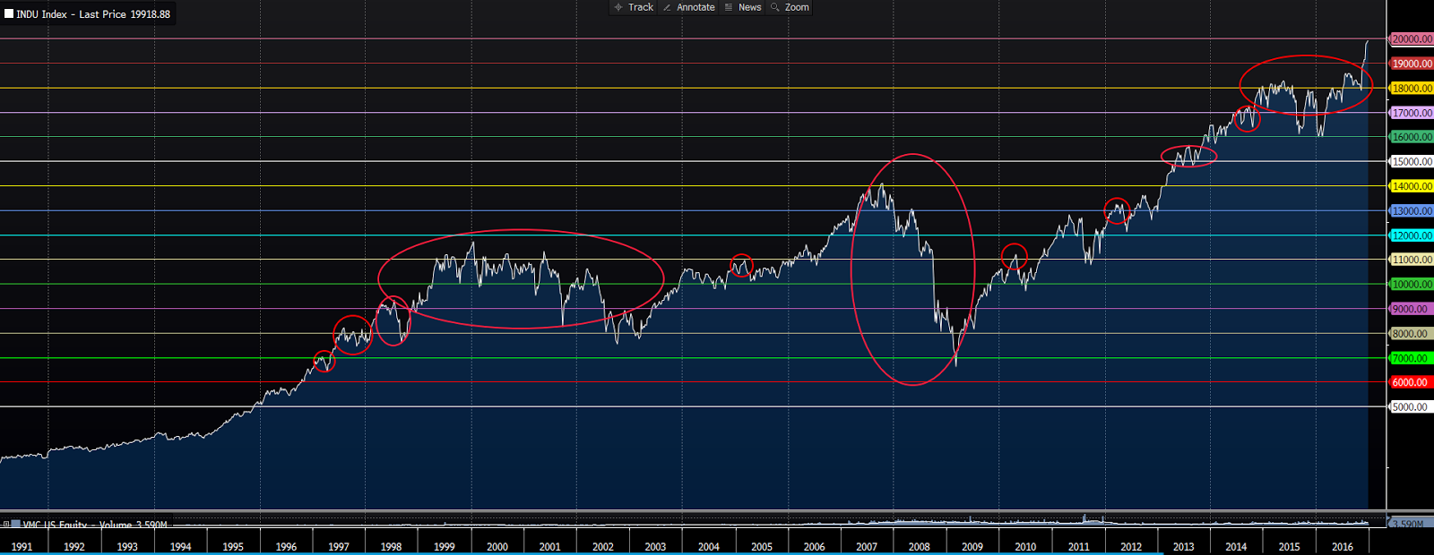 Then came 9,000. A number that for sure had the market stalling, then utterly tanking, right? Well, whether it was that particular number or Russia devaluing the Ruble, defaulting on its debt, and, in the process, taking out the world’s largest hedge fund Long Term Capital Management, we survived.