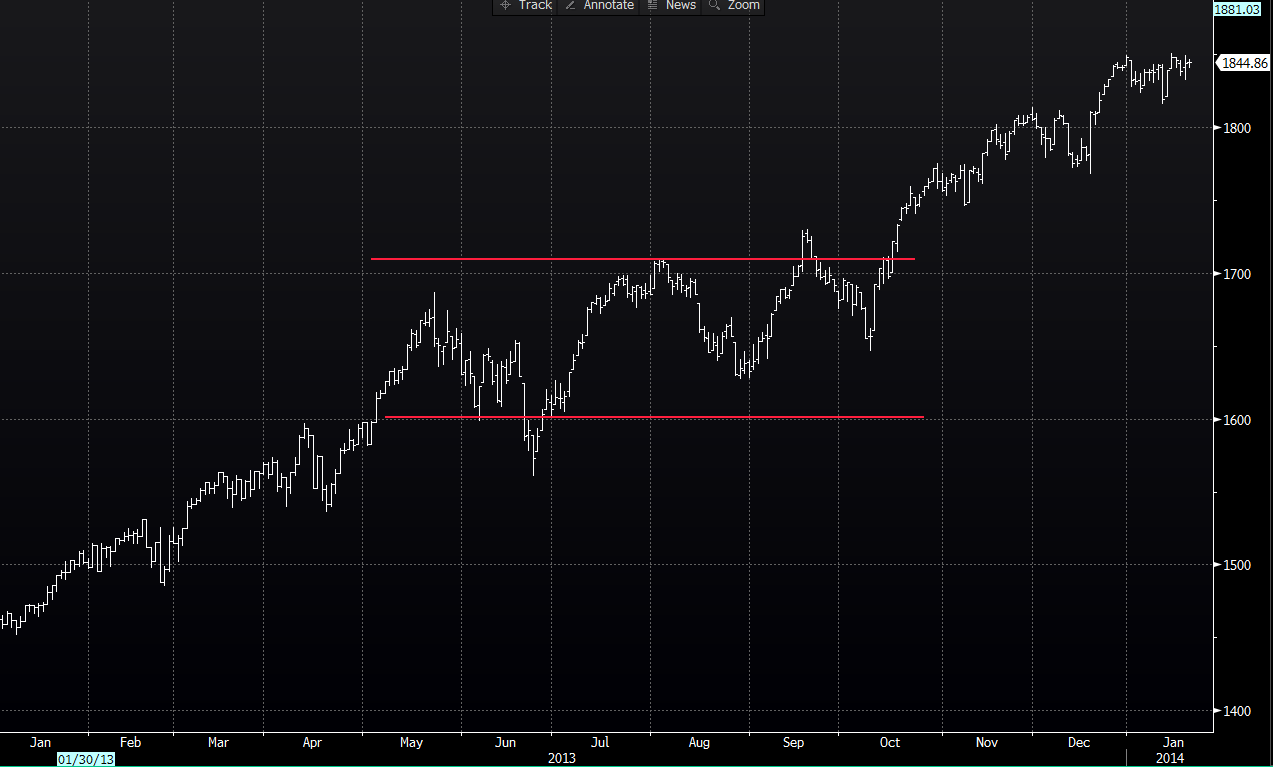 Okay, so what’s really going on? Well, actually, at the ground level — while this doesn’t answer “why” (but your question is “what”) — that’s easy: It’s kinda like #4 above. At the end of the day, stocks go up and down based on the convictions of buyers and sellers. For whatever reasons, the bulls have a stampede of conviction under their hooves at the moment. Clearly dwarfing the present level of conviction among the bears. And, frankly, that’s virtually all you need to know to know that the market’s present pace will not last forever. I mean, the bulls will get tired and, at a minimum, the bears will effectively hold back the stampede. This will come in the form of a sideways move (first chart below) where the bulls recoup a bit while maintaining sufficient strength to keep from losing momentum: click charts to enlarge…….