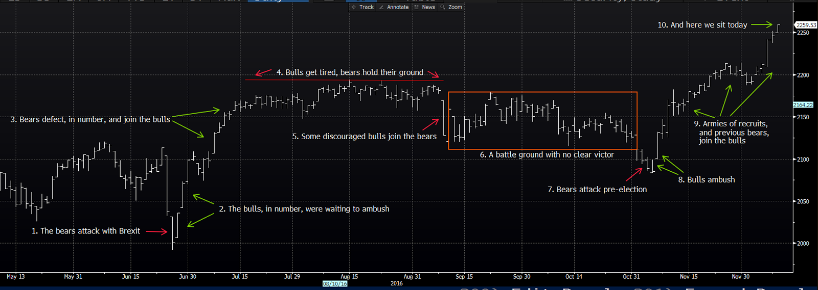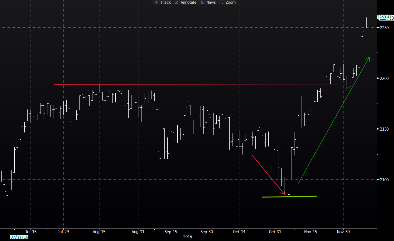 Okay, so what’s really going on? Is it Trumphoria? Is it the coming infrastructure spend, the prospects for lower corporate taxes, for less regulation? Or would we be here either way? Well, as you might recall, my commentaries leading up to the election were painting a pretty good setup (for what it was worth) going forward. But, sure, it indeed seems like something’s pulling forward some gains that might’ve otherwise taken longer to realize (the effects of which I’ll be charting for you in coming weeks/months).