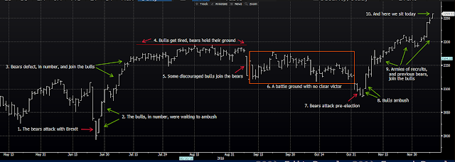 Or, lastly, an outright (and painful) retreat where traitors (defecting bulls) join the bears and push the few remaining bulls past successive support bases where they pick up a small platoon at a time before amassing sufficient forces to mount their next successful attack:
