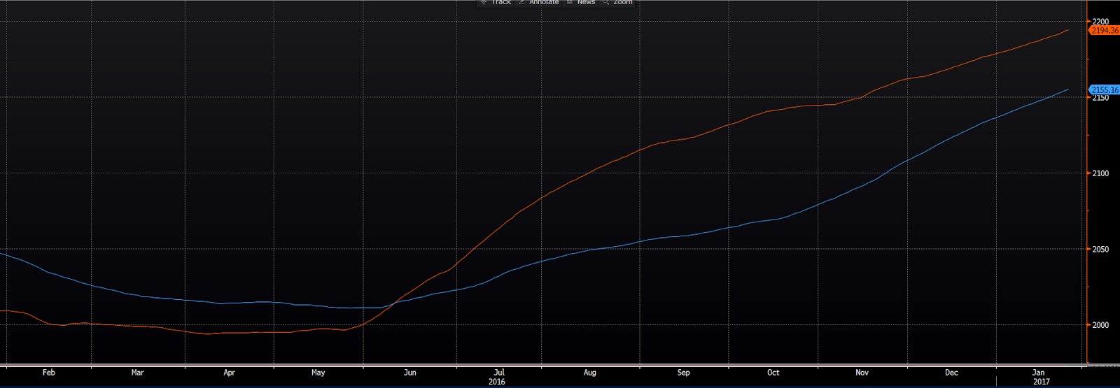 Establishing a new long-term uptrend last fall, and, at the moment, sloping nicely higher.