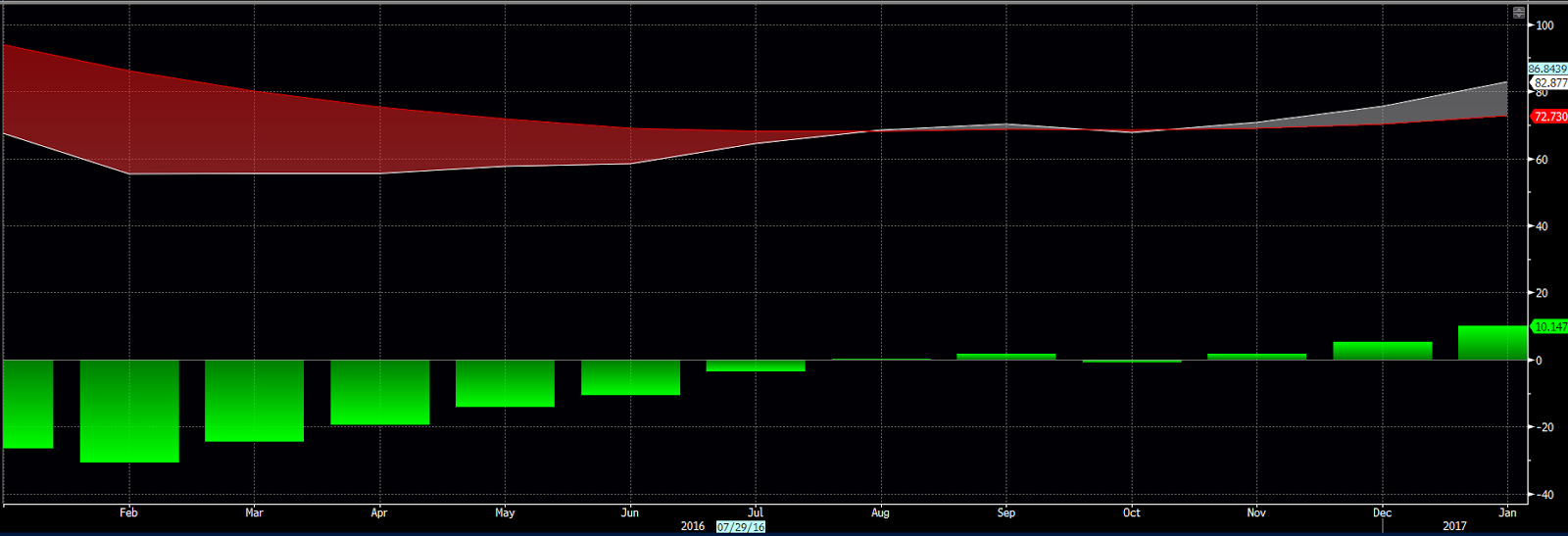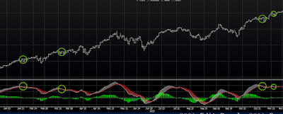 Well, if we had looked at this in late-December — when the MACD line (white) dropped below the signal line (red) — we would’ve had a short-term sell signal. But today (circle), the MACD would tell a short-term trader to buy.