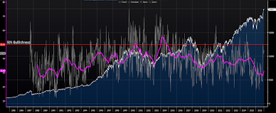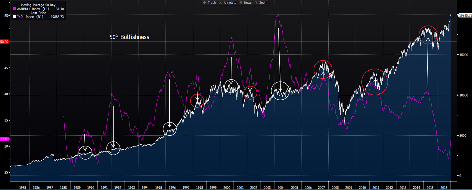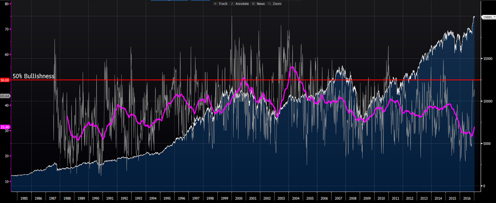 Here’s the Dow, along with the 50-day moving average of the bullish readings of the weekly AAII Sentiment Survey (purple), from the day I started my career: click to enlarge…