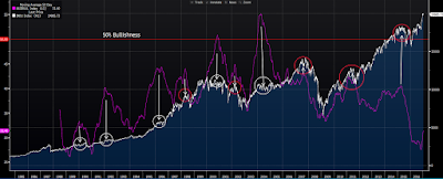 Fascinating! In all nine instances when bullishness was reaching its lows — and yes it was indeed low in those instances (under 40%) — the market was either beginning. or in the midst of, an impressive upward run. So, apparently it does indeed pay to be the contrarian — just more so when the crowd’s the most gloomy. The bummer is, like I said above, it’s not nearly as cool being the contrarian when it means being bullish.