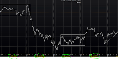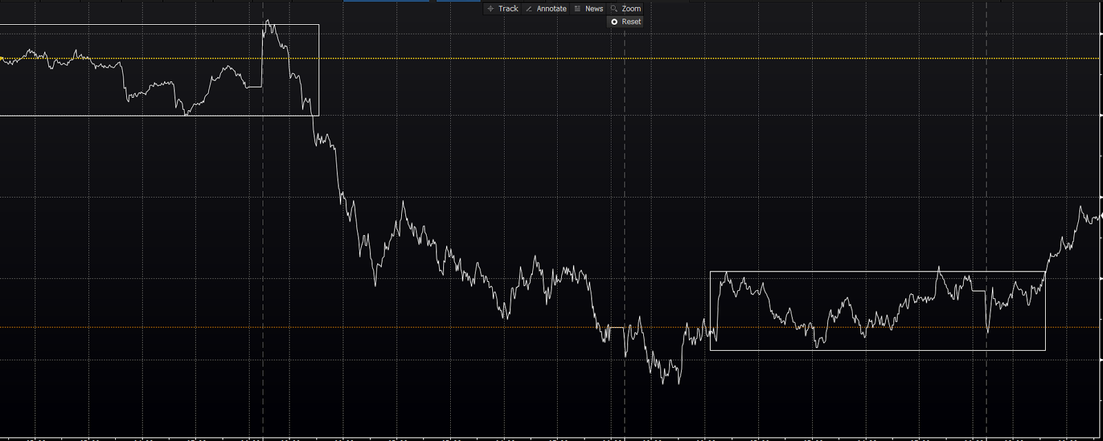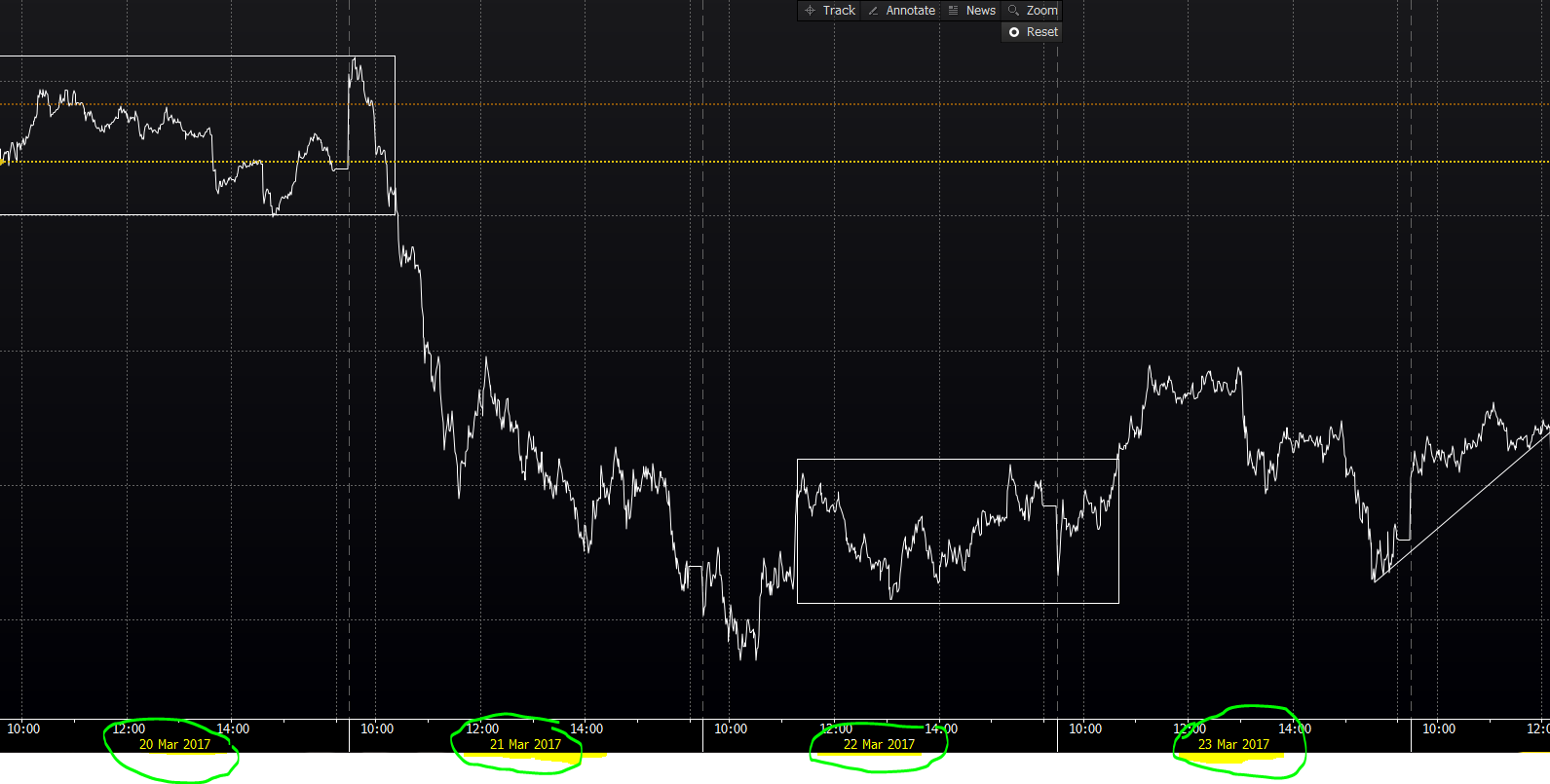 So both periods are notably similar — no doubt inspiring similar moves among trend-following traders. The thing is, while the second chart covered the daily price movements over a period of 4 years, the first one (the one now directly above [and directly below]) covered merely the one-minute price movements over the last 4 days: