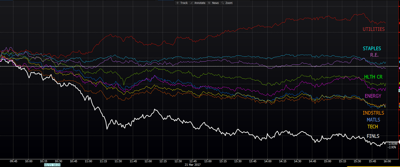So, clearly, the market was signaling that all’s not as it may appear. Right? Well, yeah, you’d have to conclude that if the stocks of companies that benefit from a growing economy, higher interest rates, a little inflation, etc., are getting creamed, we maybe have issues. Now, of course one day’s action does not a trend make. However, when we’re talking a 3% hit to the sector, financials, that stands to perhaps benefit the most from higher rates, etc., we simply can’t ignore it. Or can we?