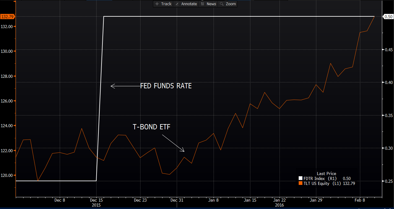 So why might traders get cold feet on their view of the direction of treasury prices amid a higher Fed funds rate? Well, take a look at how treasuries traded when the Fed raised it back in December 2015:
