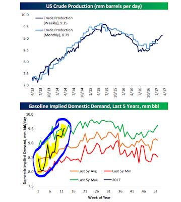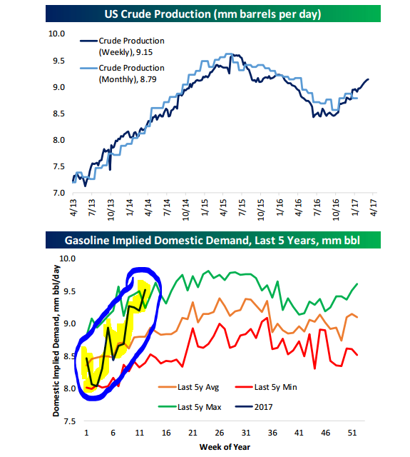 The first shows weekly crude oil production (dark line) surging higher (putting downward pressure on the per-barrel price). The second shows 2017 gasoline demand (highlighted and circled) surging higher as well (supporting the price).