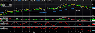 Back to the “tough place” aspect of energy as an investment destination: While the supply/demand setup, per the above, has me fundamentally scoring the sector neutral (say, a 5 on a 1-10 scale), the chart below has me technically scoring the long-term setup a 5 and the short-term a 6/7: