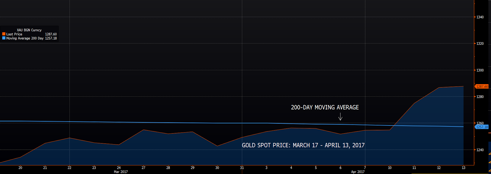 Now, gold rising as front-runner Macron’s odds decline would be something to pay attention to, given who — according to the odds makers — sits in second place (Marine Le Pen).