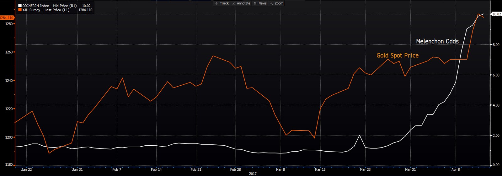 So why might safe-haven gold move with the odds that Jean-Luc Melenchon will become the next French president? Well, let’s put it this way, the guy founded his own political party last year and titled it “Unsubmissive France”.