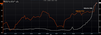 I previously referenced North Korea and the coming French elections. You want to see an interesting chart? Take a look at this one tracking gold along with the odds that a particular Frenchman wins his country’s top seat:     click any chart to enlarge…