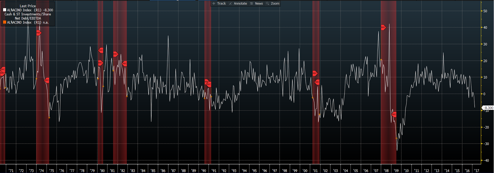 The difference between capital investment and cash flow generation represents the amount of additional capital companies must raise to meet investment needs. The lower the gap the more favorable the corporate positioning. Per the chart, the past two recessions saw the gap expanding markedly going in. The long-term norm is roughly 2% of GDP. At roughly $70 billion, today’s gap looks tame up against the U.S’s $18.5 trillion GDP.