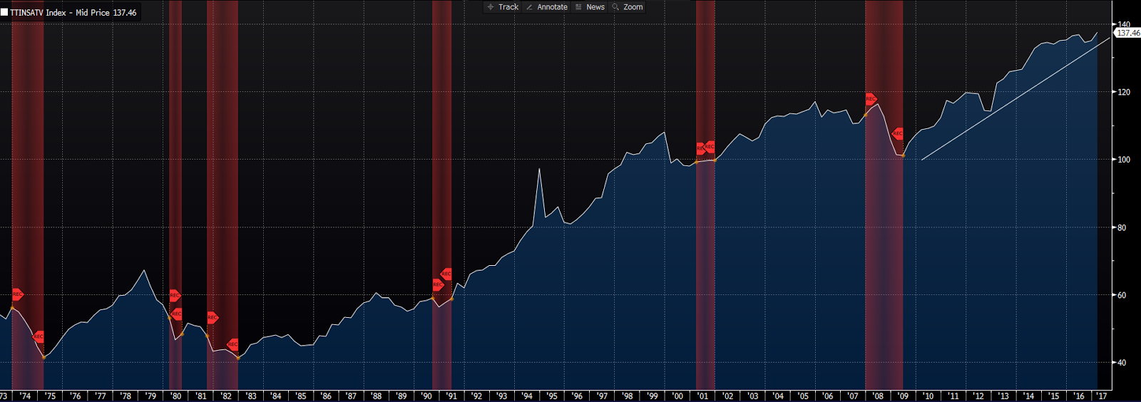 This one’s a little tricky. One might argue that a rising inventory to sales ratio speaks to forward optimism among businesses. However, it can also speak to lower-trending sales. In general, you want to see a low, or descending, ratio. When the economy is growing and spending picks up against low inventories, production has to expand, which creates jobs, improves wages and, thus, increases demand; a virtuous cycle, if you will. The recent downward trend is good news.