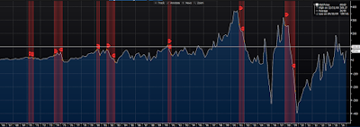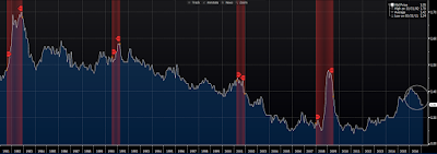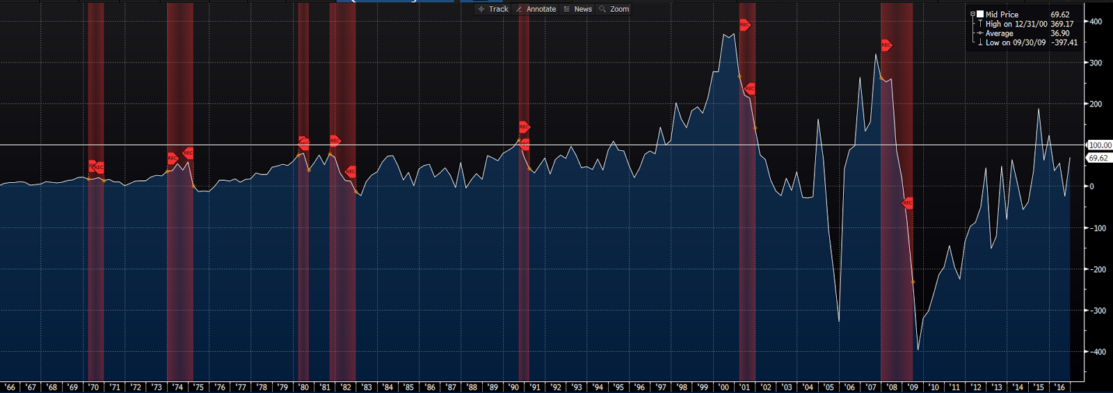 Your typical recession sees a declining trend in business lending on the way in — notwithstanding 2008 (a credit bubble), when we saw a sharp reversal just before the onset of recession. While one might argue that present record cash balances call for less financing, we’ll call it what it is, a marked slowdown in the pace of business lending and, therefore, a red flag to keep an eye on.