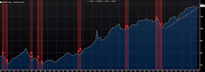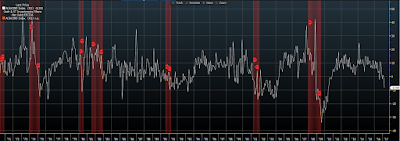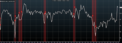 While the latest ISM survey saw purchasing managers slightly less optimistic, the overall score rests comfortably in expansion mode (above 50). My yellow highlight reflects the recent decline.