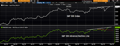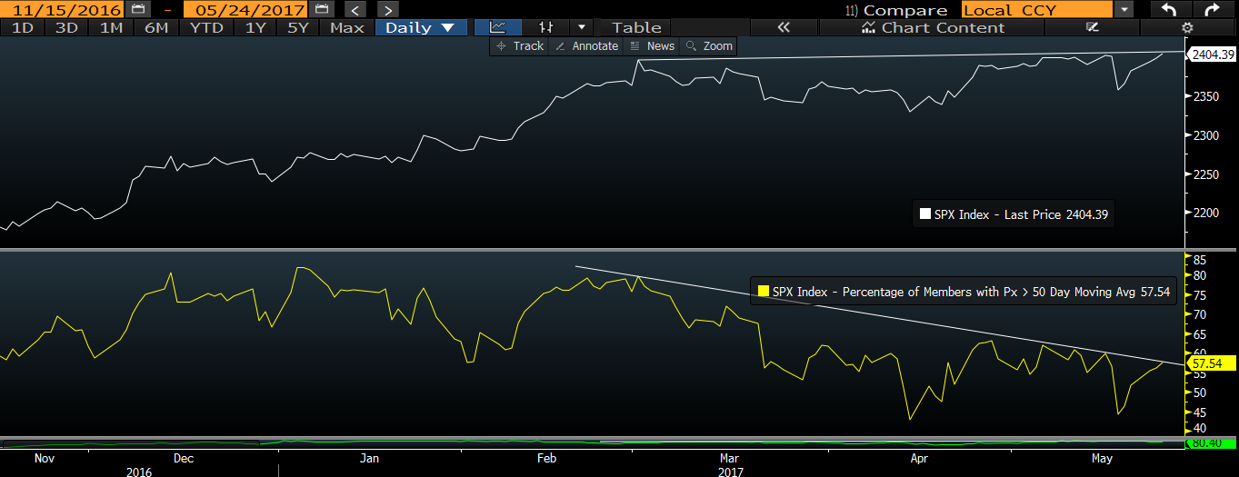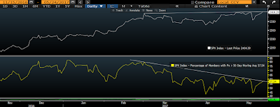 Breadth, via the % of members above their 50 dmas, trending lower amid a rising market is what we call a bearish divergence.