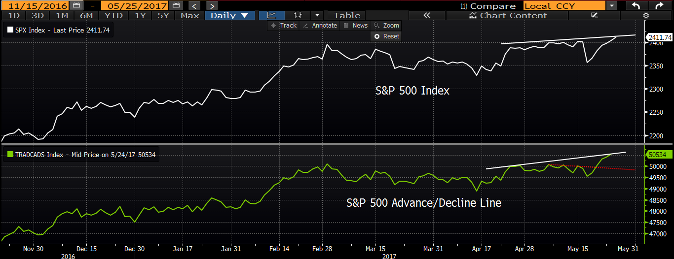 Another breadth red flag is the of late out-performance of the S&P 500 Index over the S&P 500 Equal Weight Index. Again, the S&P 500 is cap-weighted; meaning, larger cap stocks hold greater sway over the index’s performance than do smaller cap members. The S&P Equal Weight Index, on the other hand, gives the same weight to all members, regardless of size. A comparison of the two offers insight into the inclusiveness of the trend.