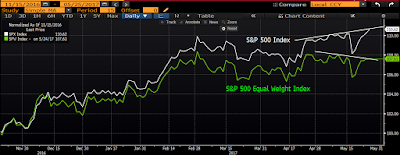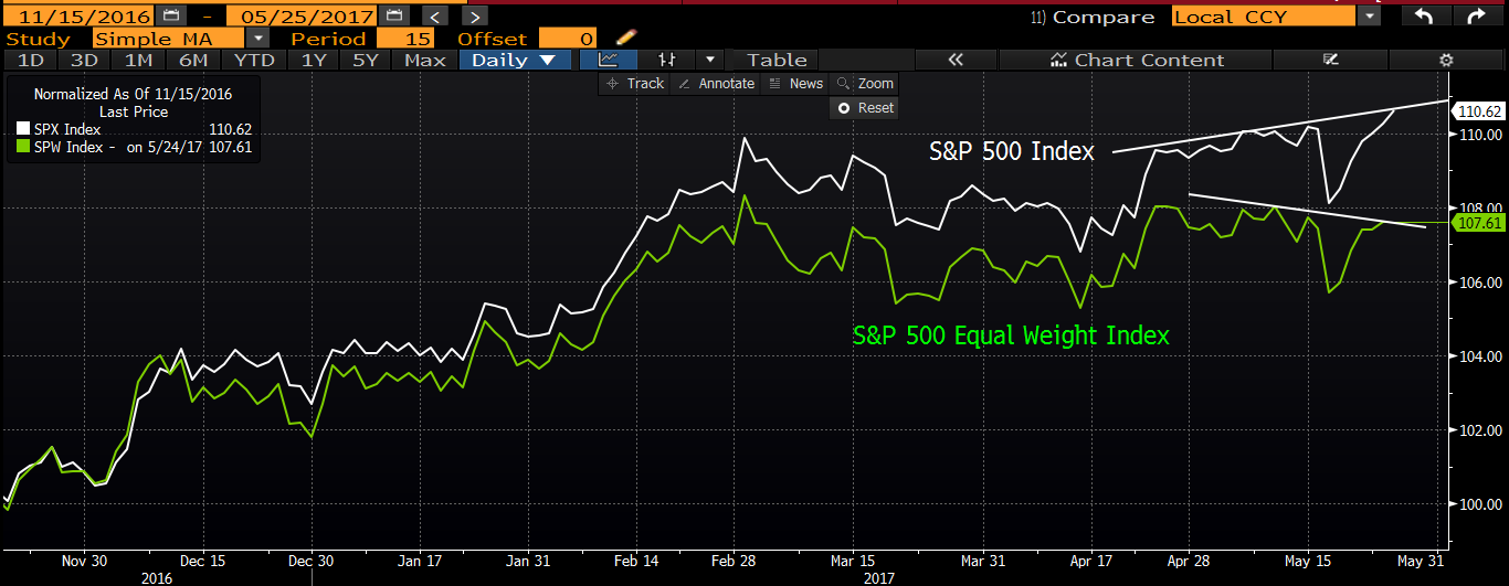 A trailing Equal Weight Index, along with a bearish divergence in the trend, tells us that recent gains have been concentrated in a few big names.