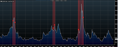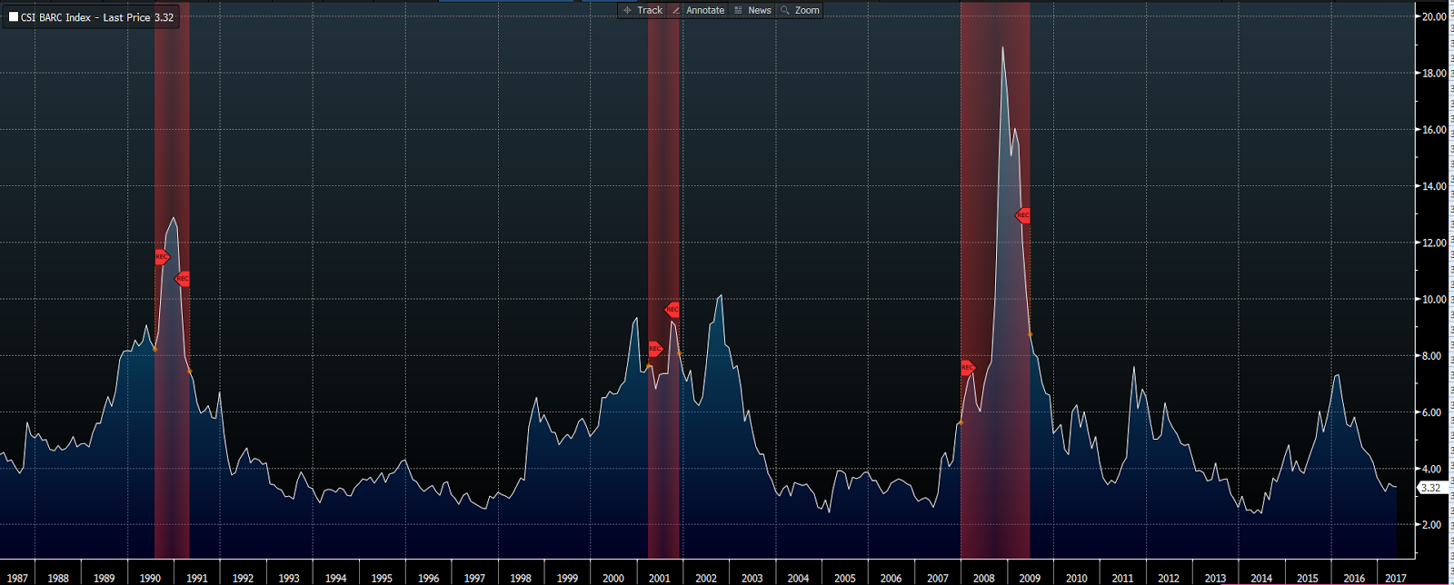 As for economic stress, here are the indicators I showed you last week. Compare present levels to those of past recessions (red shaded areas): Click here for definitions…