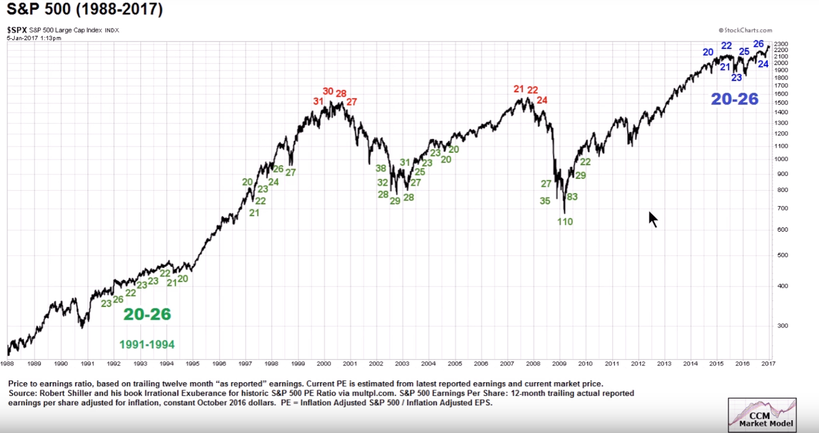 As you can see, stocks can move measurably higher off of mid-20, and much higher, P/Es. Of course, as evidenced by the 2007 peak, they can crash off of P/Es in the low 20s.