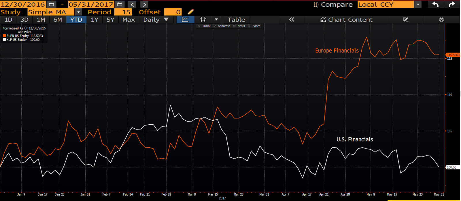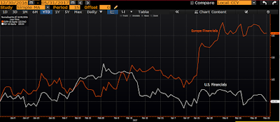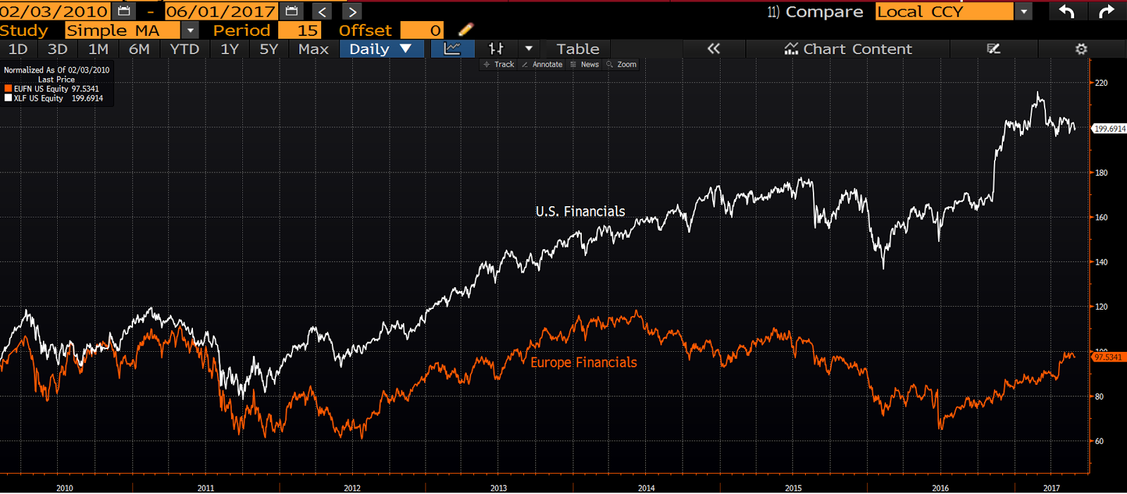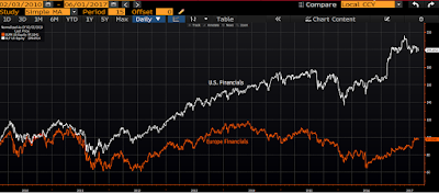 The following are highlights of a study we performed yesterday on the historical relationship between U.S. and European financial stocks: