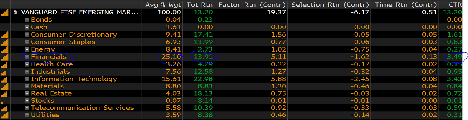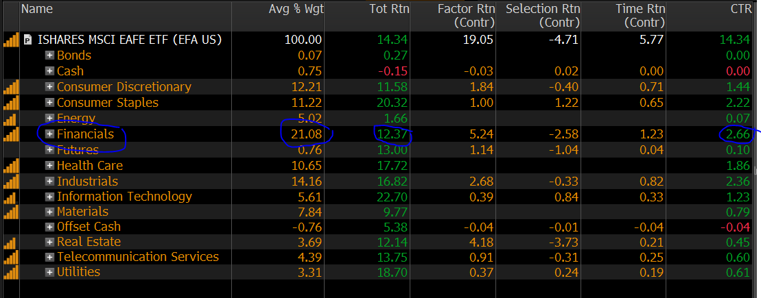 Ah, but remember, we’re a global investment shop: That 18% target also represents positions in non-US financial institutions. In fact, EFA (the developed market ETF we most use) is 21% weighted to financials and, as it turns out, financial stocks outside the U.S. are having a banner year. That 21% weighting has been the largest contributor to EFA’s 14.34% year-to-date result, itself returning 12.37%: