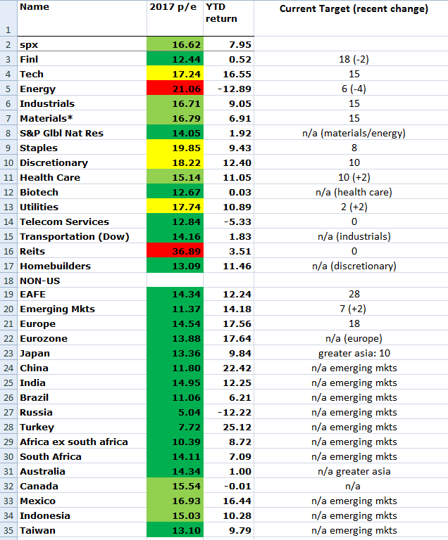 Here’s a look at our tracking of current-year price to earnings ratios for the S&P 500 (spx), major U.S. sectors, and much of the rest of the world — along with our target allocation percentages: click charts to enlarge