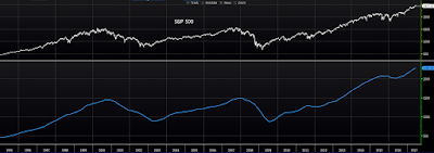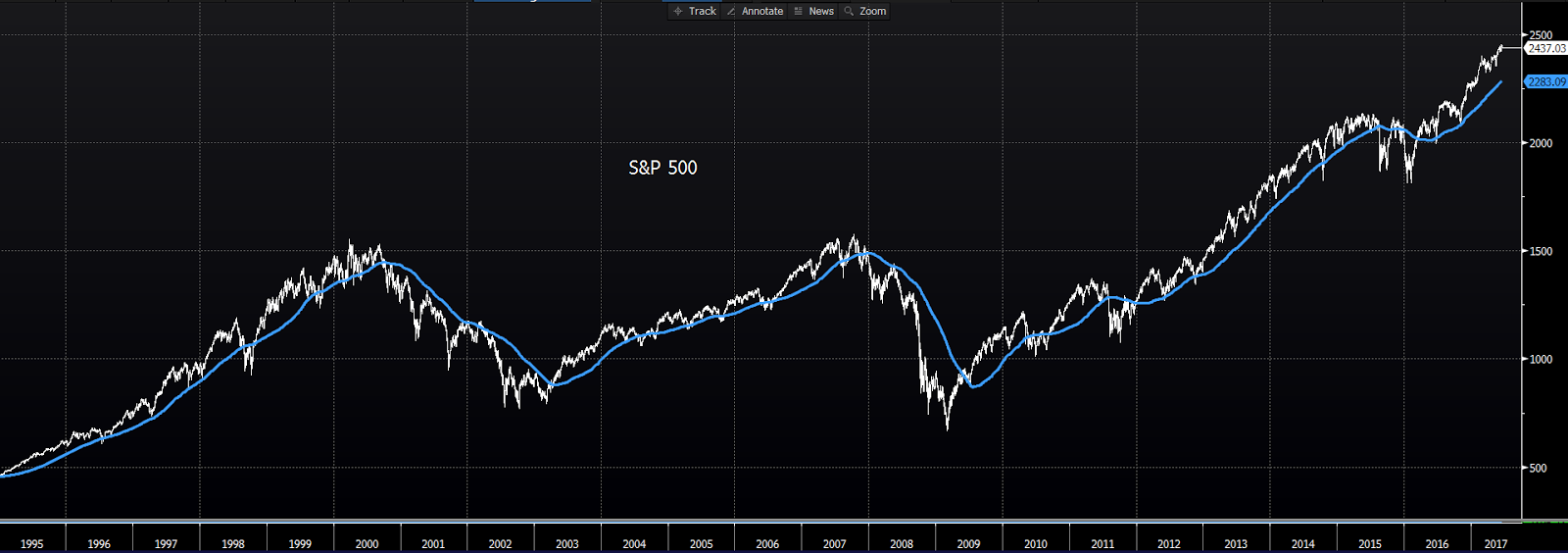 As I’ve illustrated on the videos, good things tend to happen when the S&P 500 trades above its 200 day moving average. Here’s 1995 to present (price in white, 200 dma in blue):