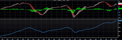 The monthly Moving Average Convergence Divergence (MACD) indicator — with its occasional exception (false signal) — does a good job of signaling long-term trend reversals. The white line moving above the red is bullish, moving below is bearish: