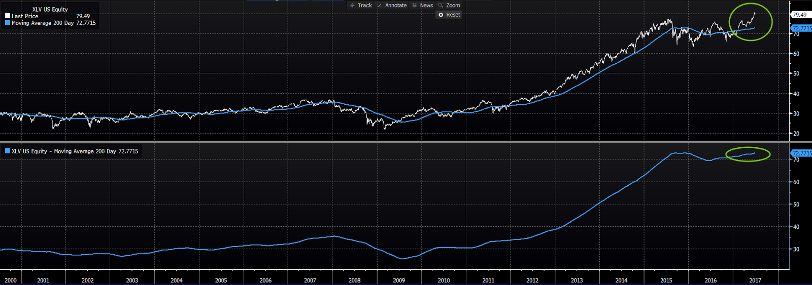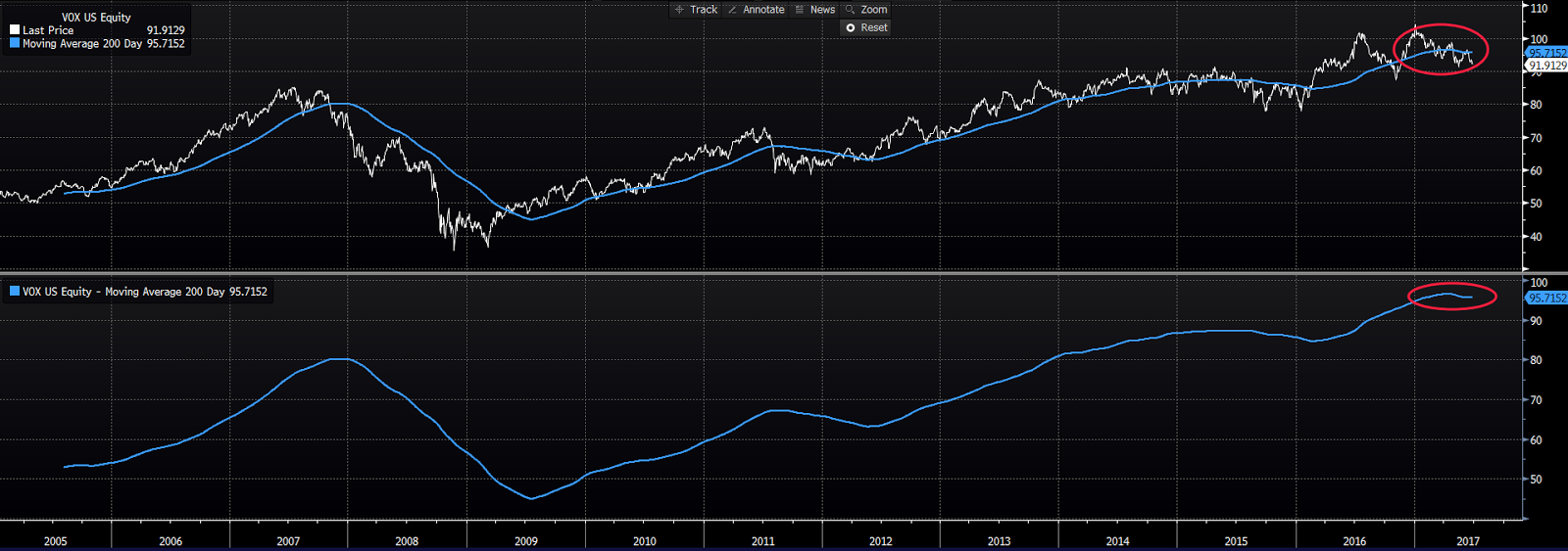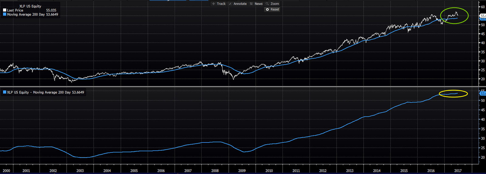 We mentioned in our year-end note that the upward trend in staples was suspect based on a flattening of its 200 dma. That flattening has persisted thus far. However, the price has retaken the 200 dma, which has served as support the past few months. While a growthy environment favors our heavier cyclical weightings, we’re comfortable with our 8% target for now.