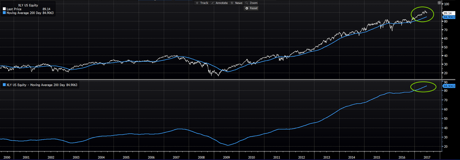 While brick and mortar retail continues to come under pressure at the hands of its online competition, the consumer discretionary sector overall holds its bullish longer-term look.