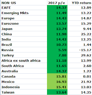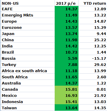 As for valuations abroad: Here’s the price to earnings table (with year-to-date results) we showed you then.