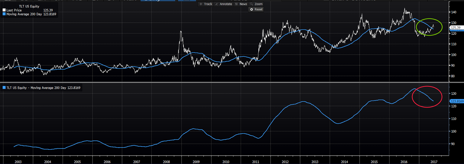 Here’s the TLT (tracks the 20-year t-bond) chart from our year-end commentary: