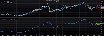 For starters, here’s the 20-year daily chart where — on the top panel — we showed the S&P 500 index’s relationship to its 200 day moving average (dma). There’s a yellow arrow pointing to every instance where the index touched or dipped below its 200 dma (a warning to beware of a trend reversal). The red arrows are pointing to two definitive trend-reversal signals (the rolling over of the 200 dma). The red and green curves highlight failed upside and downside breakouts respectively. The green arrows signaled trend reversals via the 200 dma turning upward.