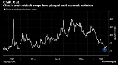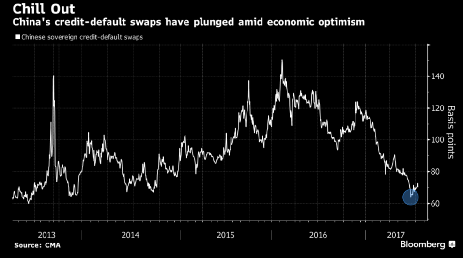 On several occasions herein (here’s one) we’ve touched on the importance of tracking Credit Default Swap spreads as measures of potential stress in the global financial system. Well, the cost of protecting one’s Chinese debt exposure recently hit a four-year low. Strongly suggesting that a hard landing in the world’s second largest economy remains unlikely for the foreseeable future:
