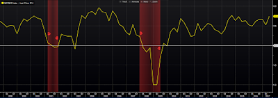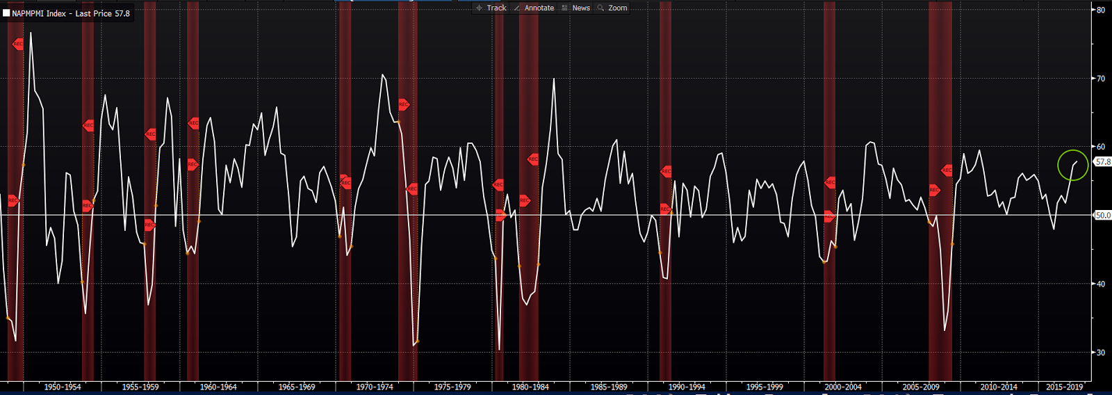 Here’s a 70-yr graph (yep, they’ve been doing this a very long time) of the manufacturing survey (red shaded areas are recessions). Above 50 (white horizontal line) denotes expansion, under 50 means look out below!: