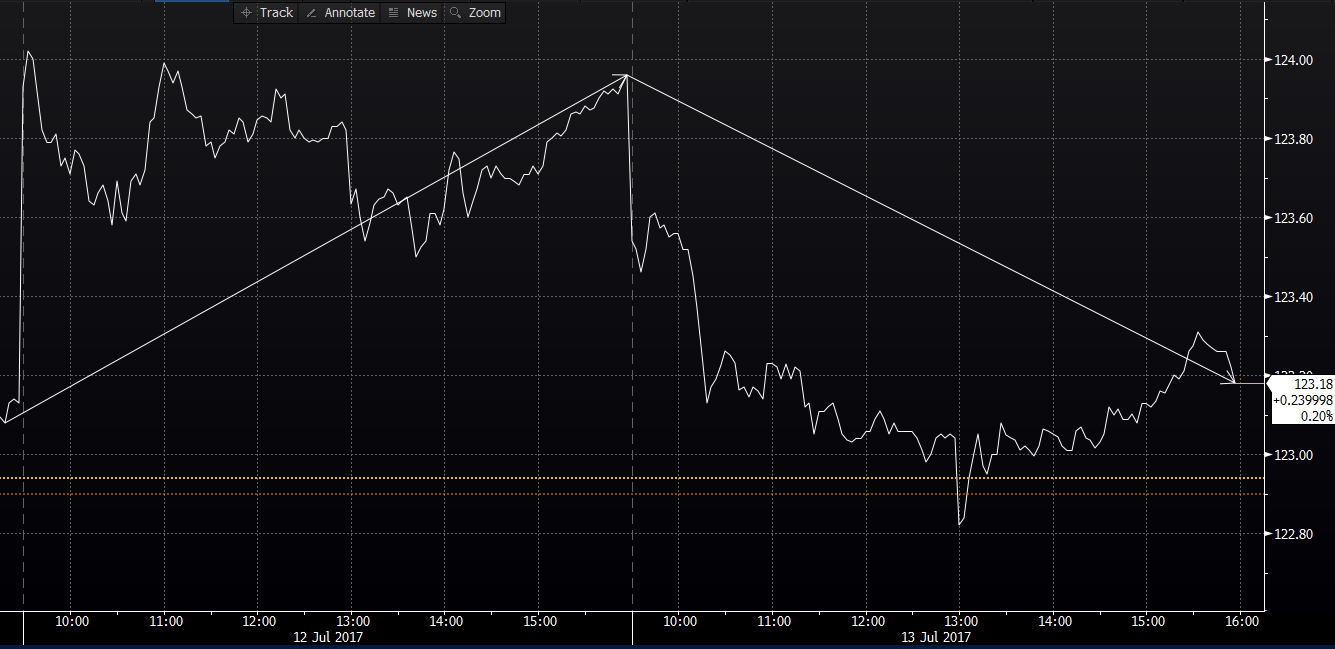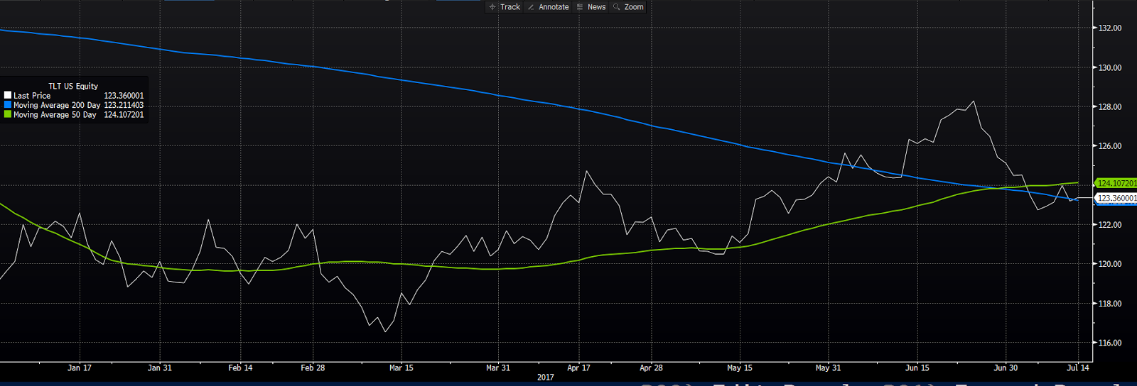 The market-relevant message from Ms. Yellen was that the Fed sees itself being soft on interest rate increases going forward while beginning to unwind its massive balance sheet (the t-bonds and mortgage backed securities it bought off of bank balance sheets during the last recession). Bond traders, heartened by the written release of what would be her dovish testimony, bid up prices on day one, then, disheartened by who knows what, sold off on day two: