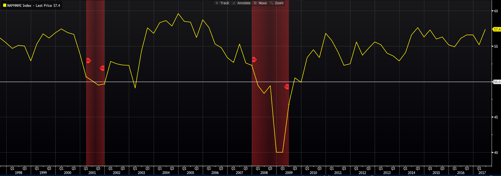 Well, the folks at the Institute for Supply Management can help. Every month they survey hundreds of purchasing managers across both the manufacturing and service sectors and ask them a slew of direct questions. Then they score the answers and index the results. In our view, those monthly purchasing manager surveys are among the very best gauges of the overall health of the economy.