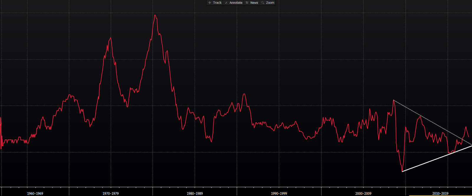 Here’s the second item again. Note the higher lows and the apparent break above what looks to be an 8-year triangle pattern: